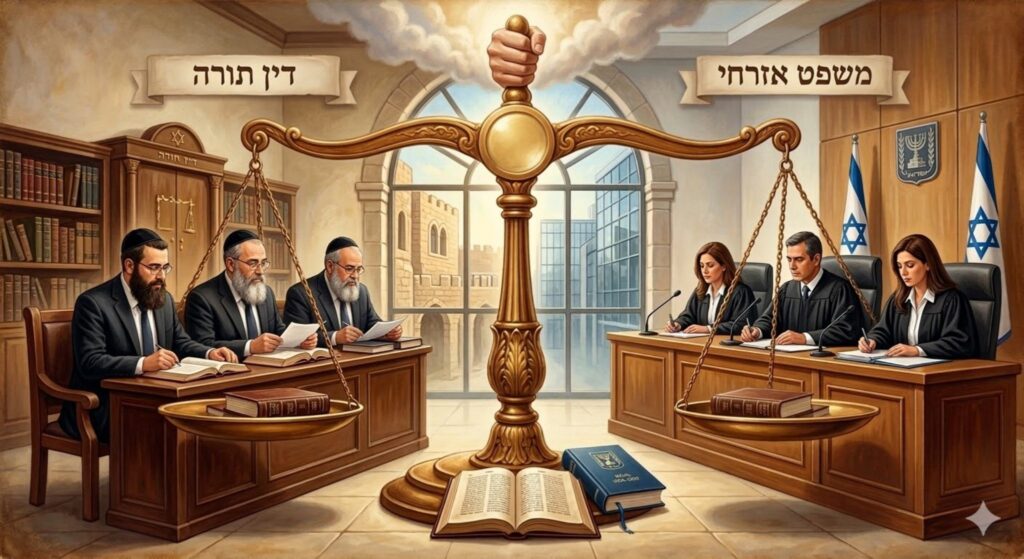 אמנם יש אזכור להפרדת הסמכויות הזאת כבר במשנה והתלמוד (כגון המגבלות שחלות על מלך), אך הניסוח השיטתי של הפרדת הרשויות היהודית מופיע אצל הר"ן, רבי ניסים גירונדי שפעל בספרד במאה ה-14. בדרשה י"א הוא מסביר שכל אומה צריכה שלטון מדיני על מנת למנוע אנרכיה ולהשליט סדר, ולכן המדינה מעמידה שופטים מטעמה. כך גם עם ישראל, גם הוא זקוק למשפט המדיני! ההבדל ביננו לבין הגויים הוא בכך שיש לנו עוד קומה: משפט האמת והצדק. מטרת דין התורה הוא לבטא את עקרון הצדק האלוהי המוחלט.
